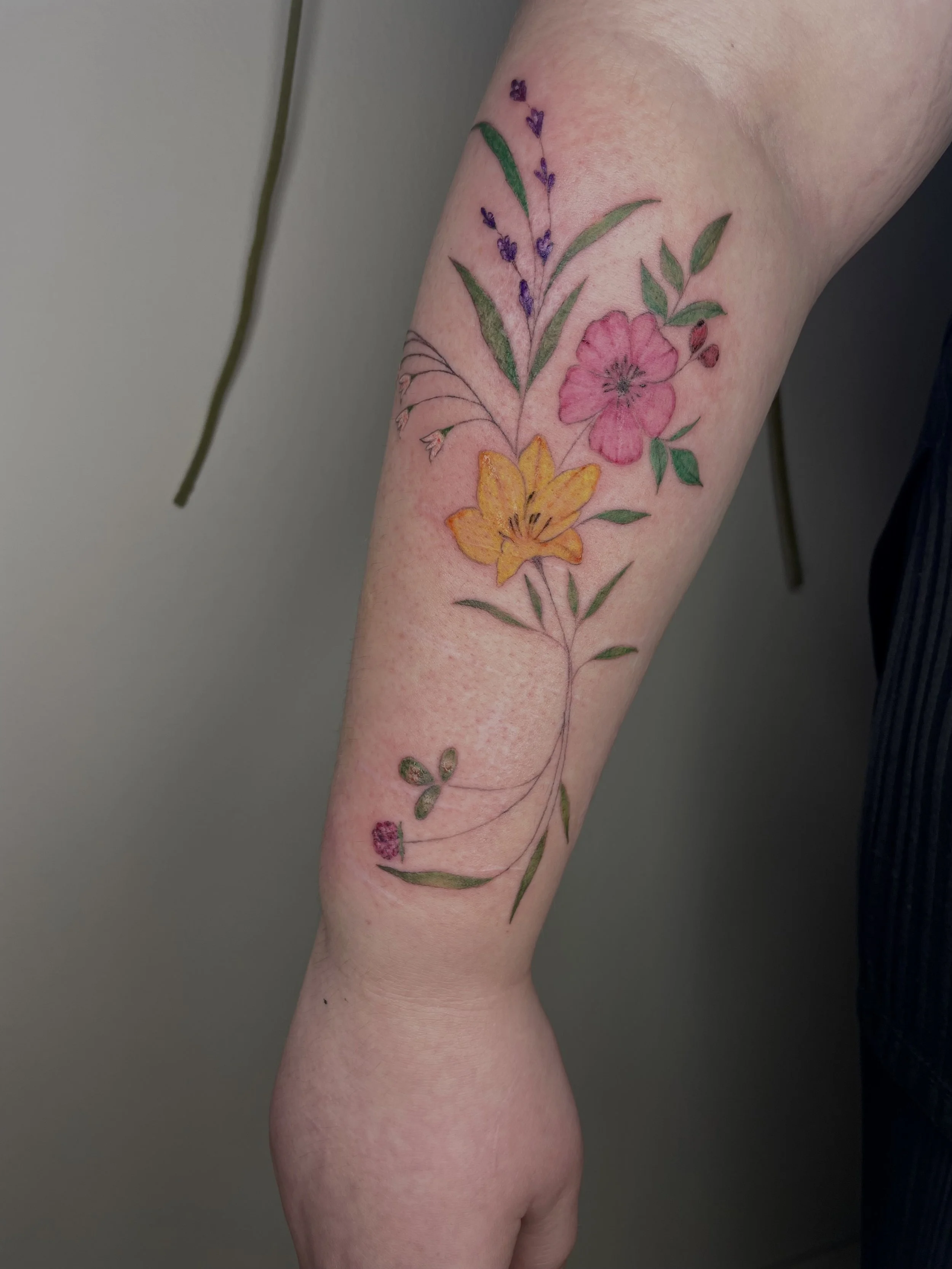 Tvořím jak jemné květinové a rostlinné motivy, které přirozeně kopírují křivky těla, tak ornamenty a symboly s hlubším významem. Florální motivy vytvářím metodou freehand – přímo na těle v den sezení, aby dokonale ladily s tvou siluetou a působily organicky. Ornamenty a symboly naopak připravuji předem, protože geometrické tvary vyžadují přesnost a pečlivé plánování.